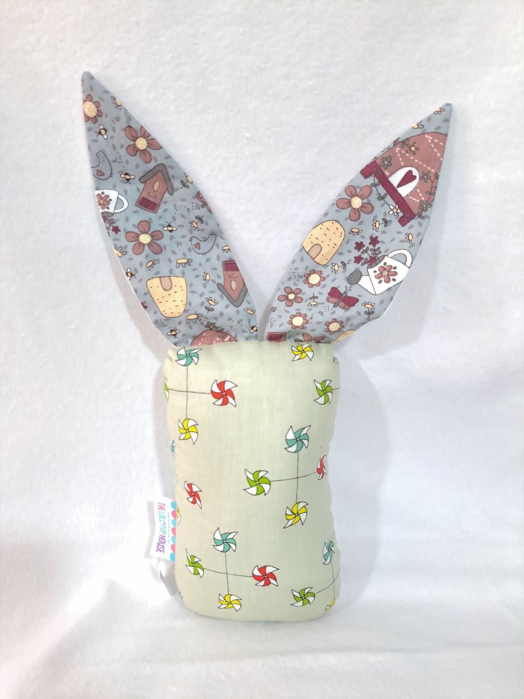 This little bunny plush has long ears and a label that some babies love to suck, chew, or rub. The outer shell is made of cotton fabric, with polyester filling.